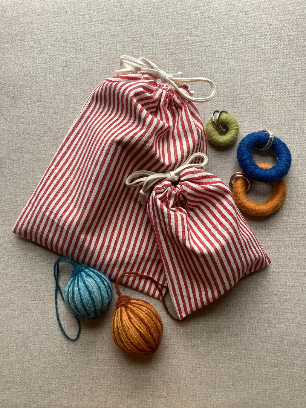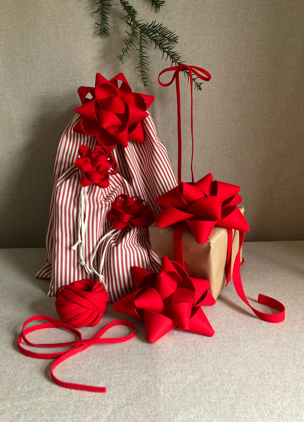 Handmade in our Yorkshire studio using a dead-stock red and white yarn dyed striped cotton fabric, which was woven locally in a mill that is sadly no longer running. This fabric lends itself perfectly to Christmas and as shown in one of the images can be further decorated using our handmade 100% woollen bows as seen here. The bags have a drawstring top that pulls together and can be tied into a bow to keep it fastened.
