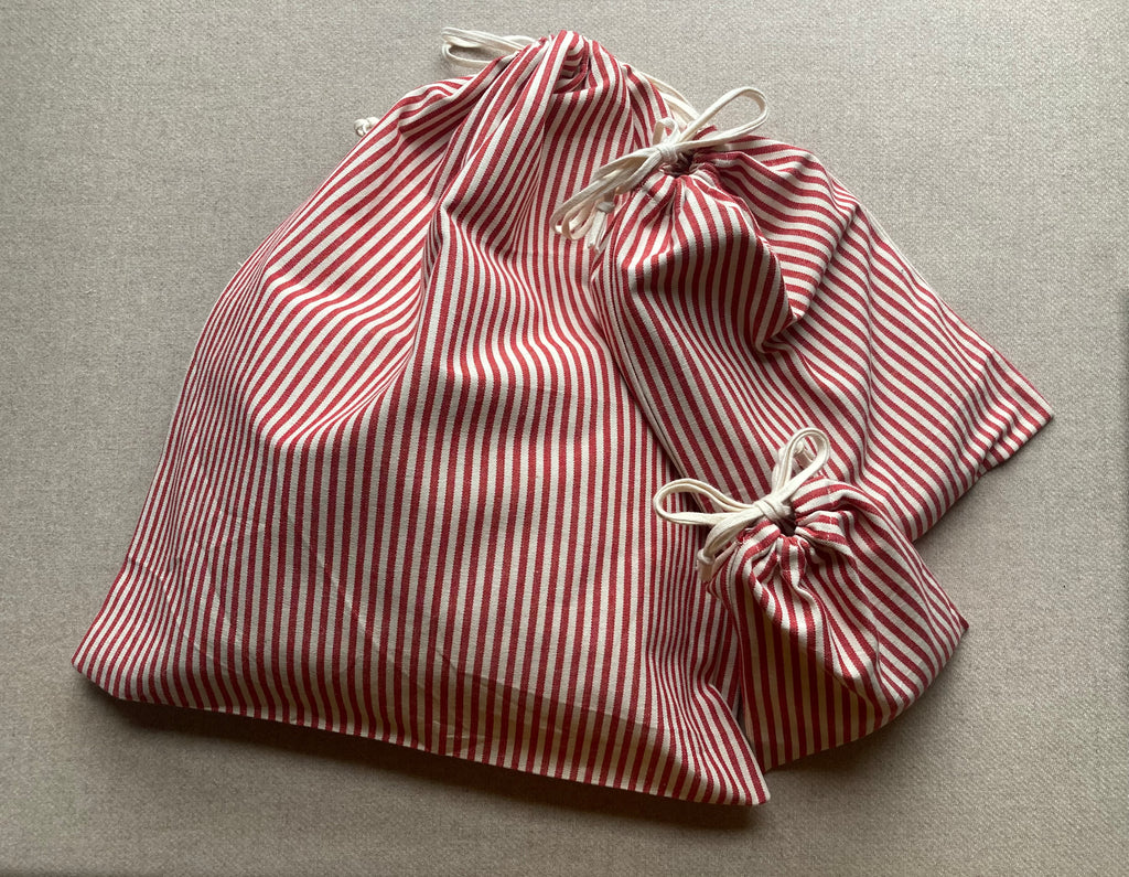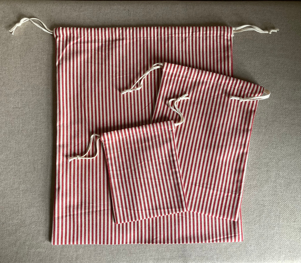 Handmade 100% Cotton Red and White Stripe Drawstring Gift Bags